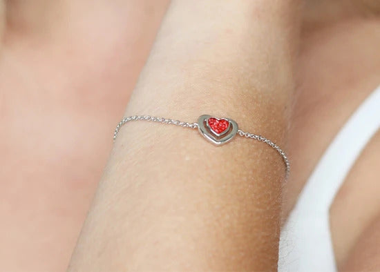 Ladies Valentine memorial bracelet with a heart-shaped mount to hold the resin containing the cremation ashes, set within a larger heart which is attached to a fixed adjustable chain. The resin comes in twelve colours and the ashes will be permanently sealed and suspended within it. Real diamond dust can be included in the mixture. The bracelet is available in Sterling Silver and 9k Gold and comes in a presentation box.