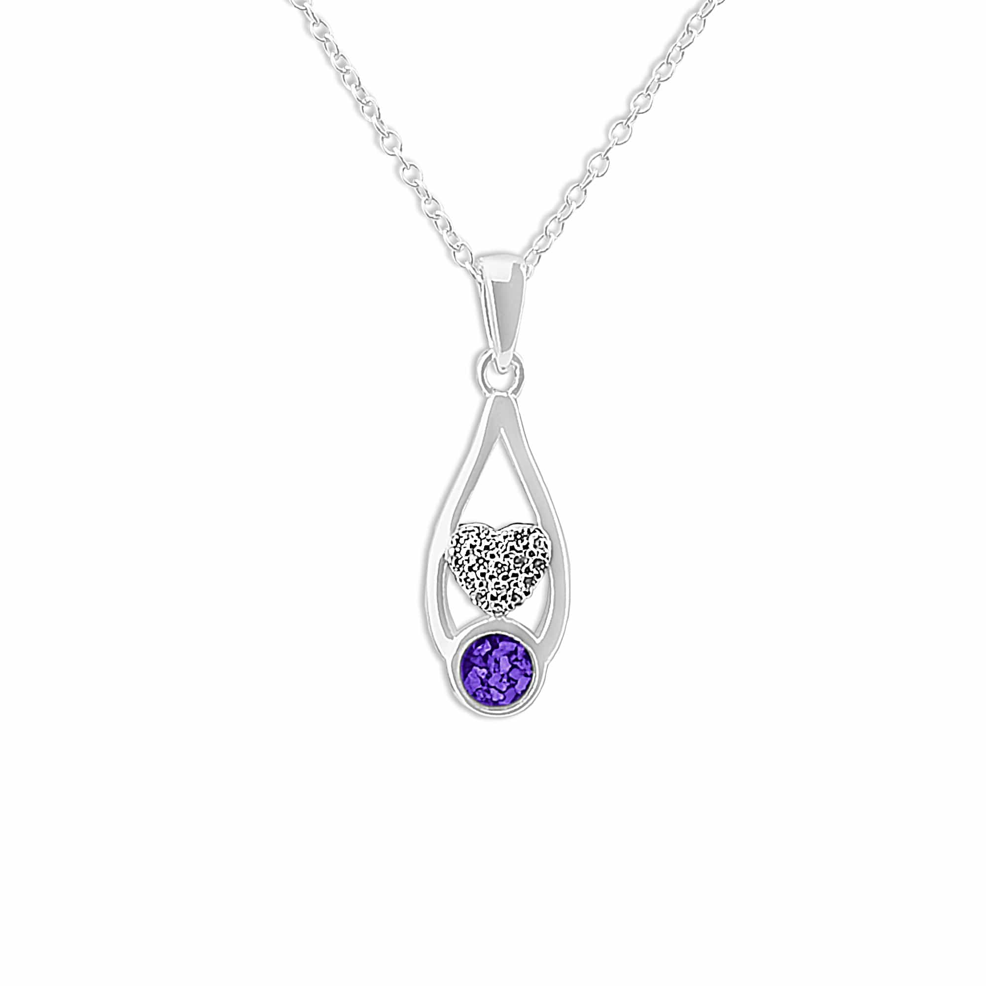 Ladies Protect memorial pendant with a central heart formed of Fine crystals above a circular mount set within a teardrop form. The cremation ashes are mixed into the resin in the chosen colour and entered into the mount. There is a choice of twelve different resin colours and diamond dust can be included on request. The pendant comes in a gift-wrapped box and includes an eighteen-inch chain.